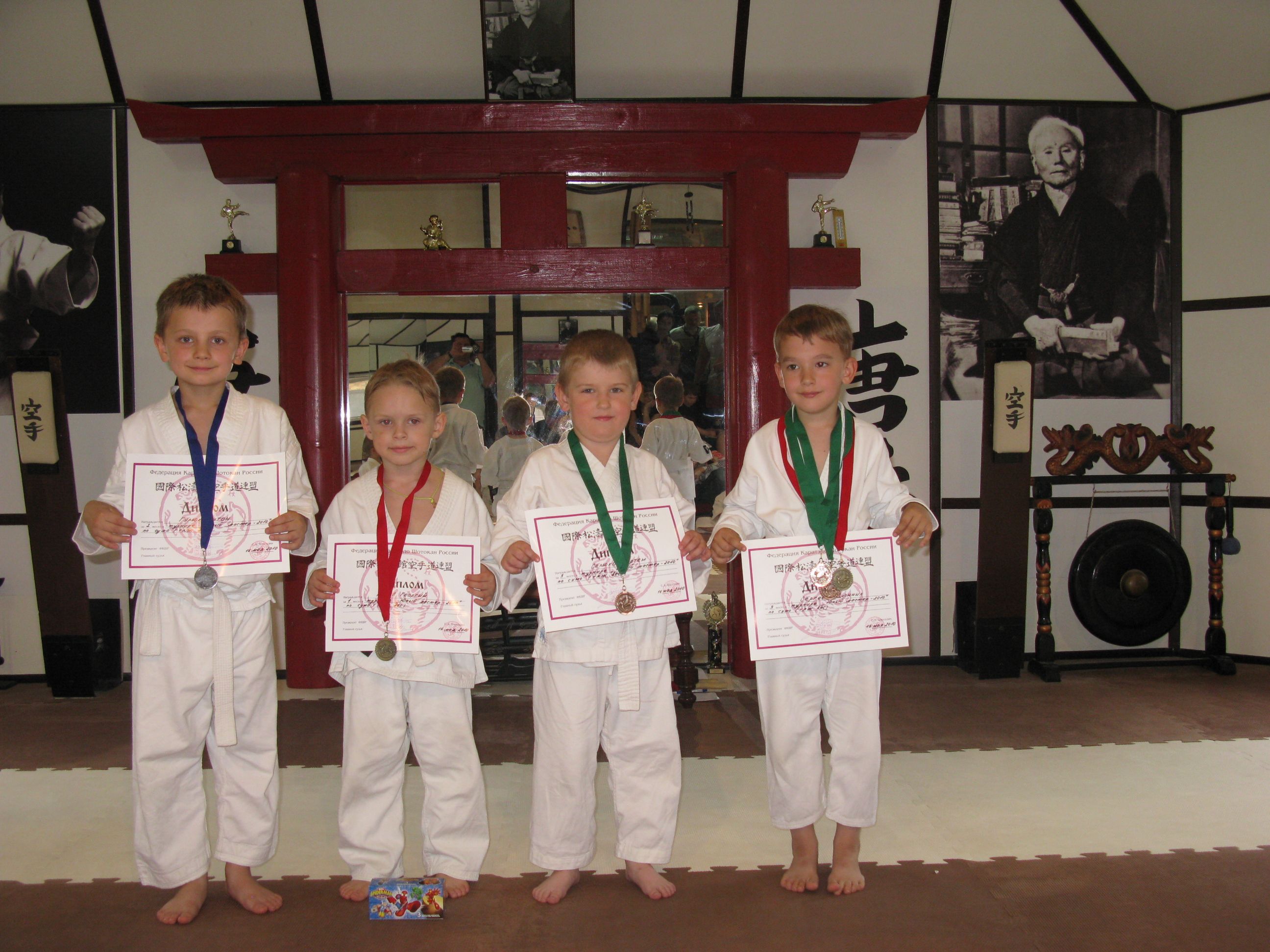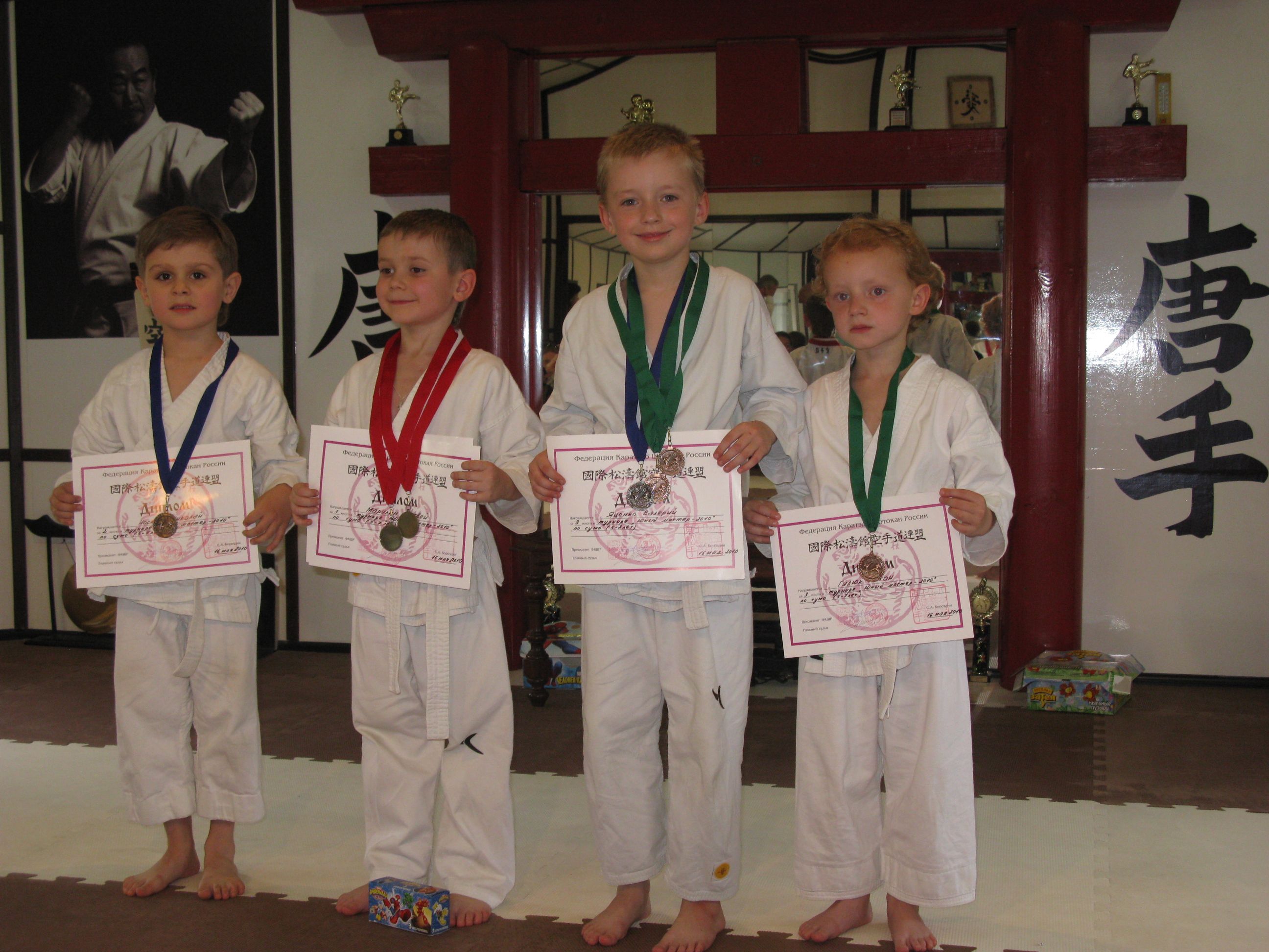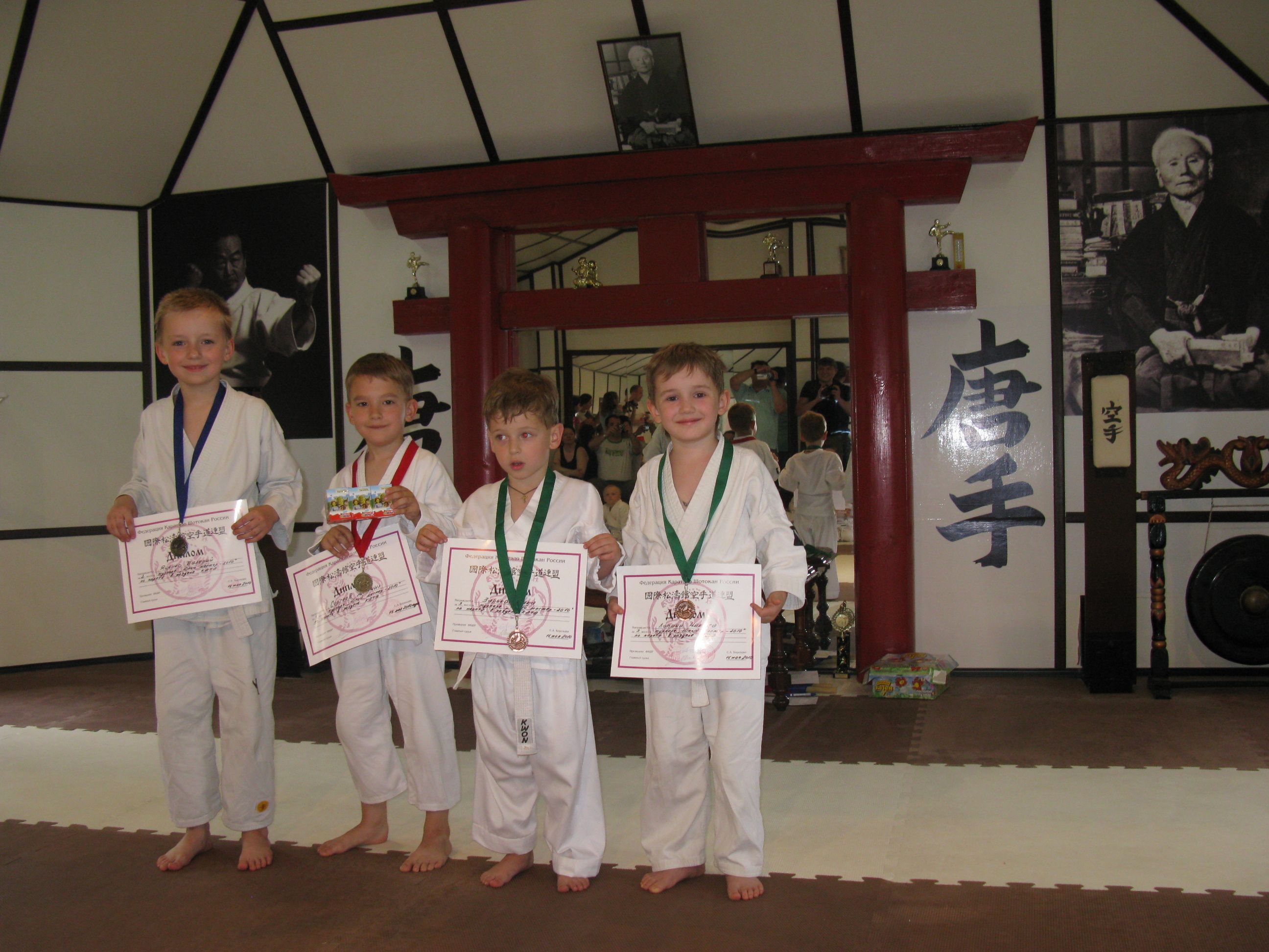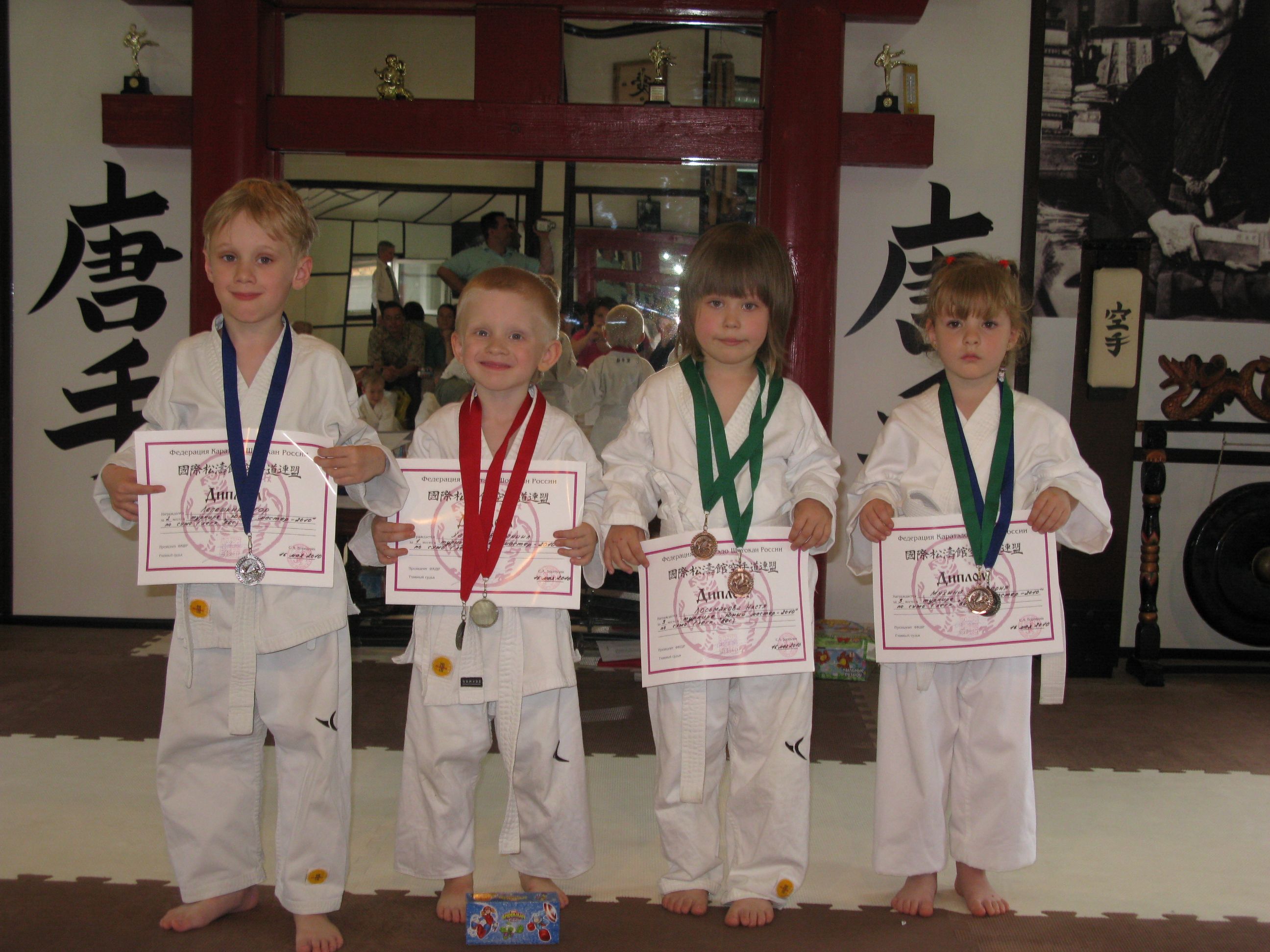 Всем им от 3 до 5 лет. Возраст юный и нам хотелось придать соревнованиям вид фестиваля, где собственно общение, это уже праздник. Для этого всем участникам приготовили сладкие подарки и сувениры. Однако спортсмены желали соревноваться и только соревноваться. В результате которых, они были награждены в своих номинациях, возрастных группах и весовых категориях настоящими (а не только шоколадными) медалями и дипломами.
